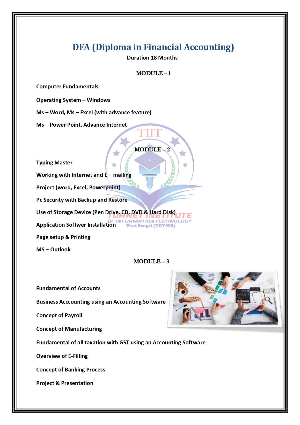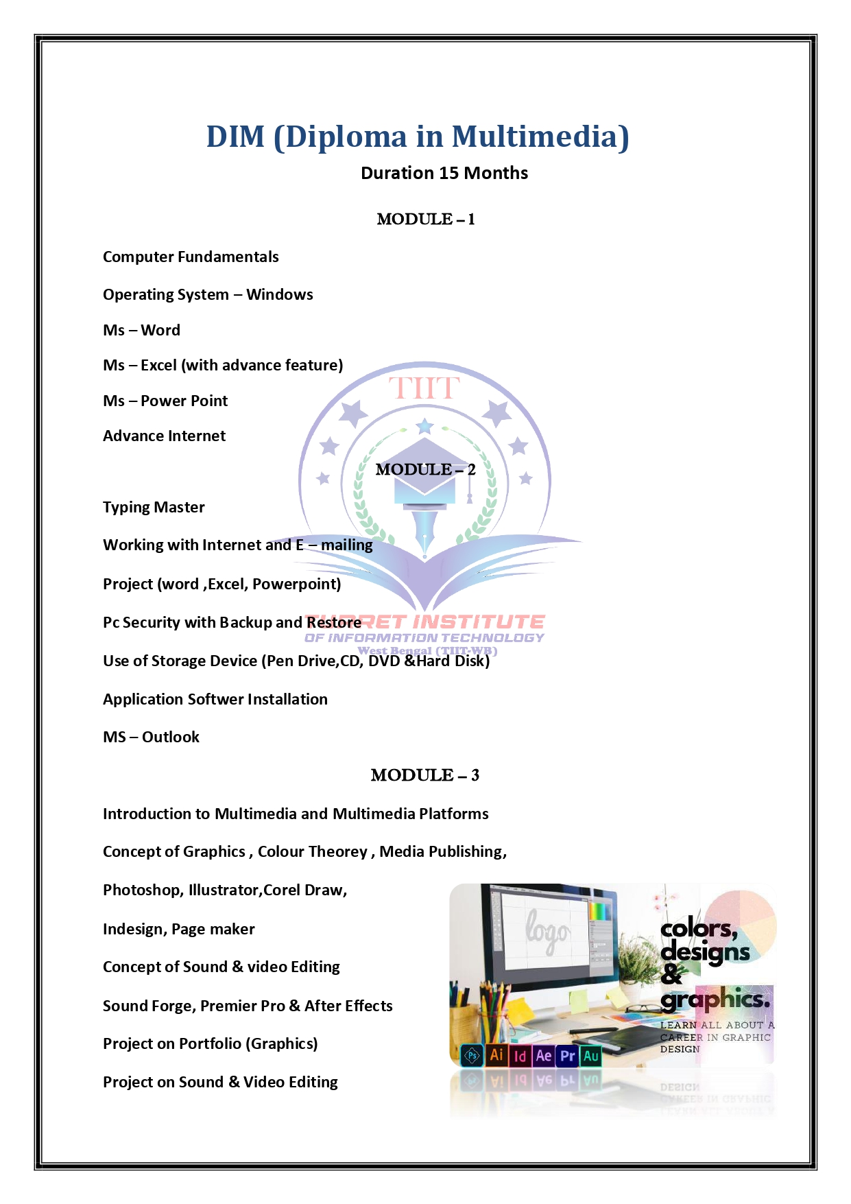 Fundamentals,Word,Advance Excel,Power Point,Internet E-Mail,Concept of Graphics,Photoshop,Illustrator.